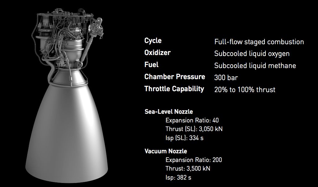 猛禽发动机的直径仅有为1.3米,室压约30兆帕,单台推力不低于200吨,尽管推力略小于“蓝源”的BE-4,但体积和燃料利用率却远优于后者。根据马斯克的说法,未来安装在星际飞船上的猛禽发动机可以免维护使用100次,简单维护后可以重复使用1000次。