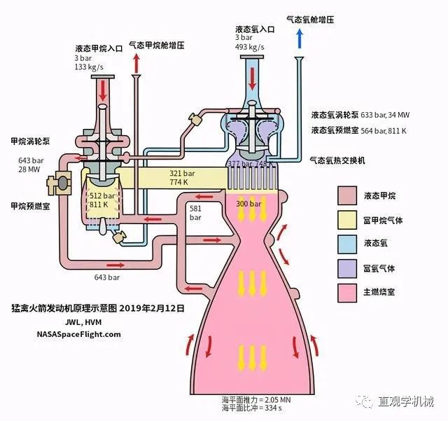 “全流量分级燃烧”发动机通过使用多个燃烧室,部分燃料先进入预燃室燃烧,产生的推力再推动涡轮泵,驱动全部燃料进入主燃烧室燃烧并产生推力,可以将每一丝的燃料都转换成推力!